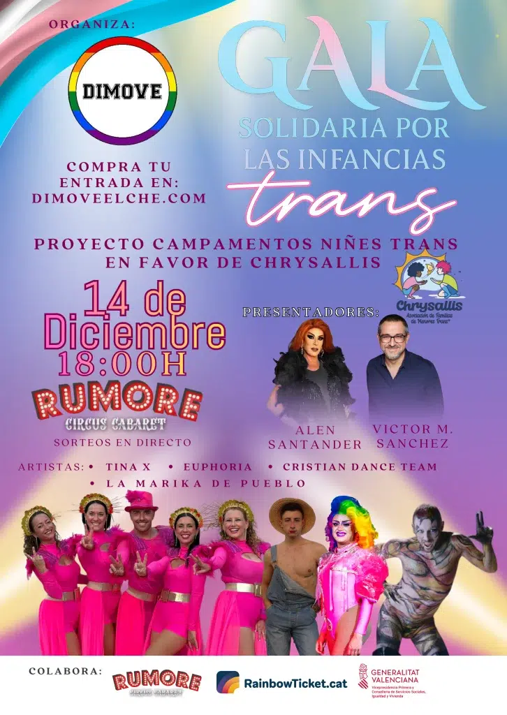 Desde Dimove lanzamos nuestra I Gala Solidaria, cuyos beneficios irán destinados al proyecto de Campamentos para Niñes Trans de Chrysallis, la asociación de referencia en la lucha por la infancia trans a nivel estatal. El 100% del importe de las entradas fue destinado a la causa benéfica, asumiendo Dimove todos los gastos.